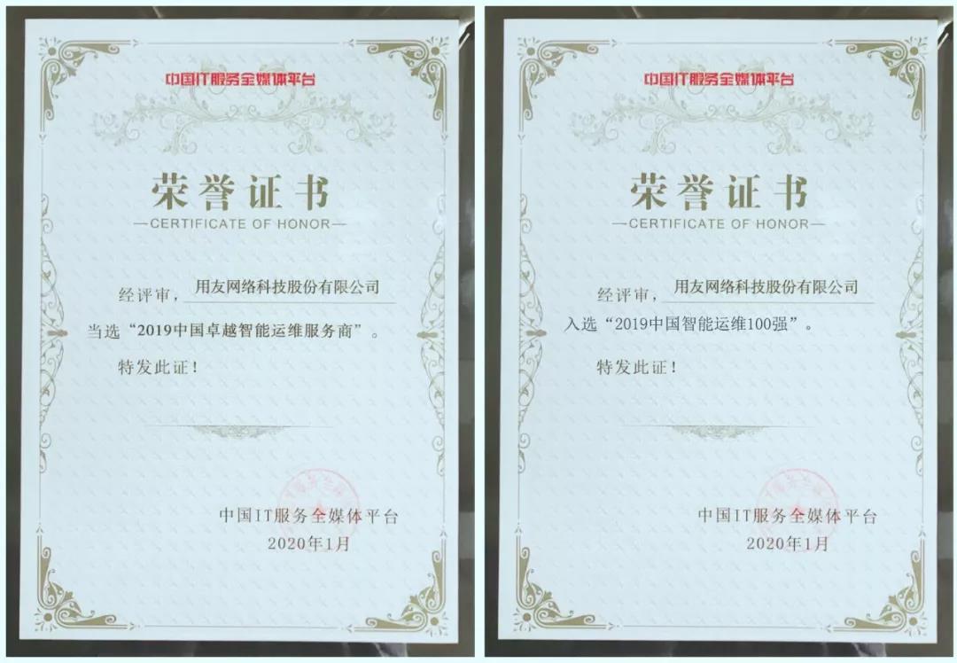 【榮譽】用友喜獲 2019中國IT服務領(lǐng)軍企業(yè)和智能運維服務商兩項大獎